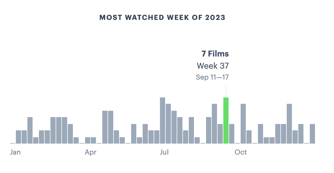 See why we love Letterboxd? For some reason, these two stats tickle an inch in my brain. I am far too lazy to figure out most watched days and weeks but these graphs did something for me that I didn’t know I needed. I’m available for hire FYI! Sidenote, not going to find out about the day, but I can show you all the films I saw in a single week: